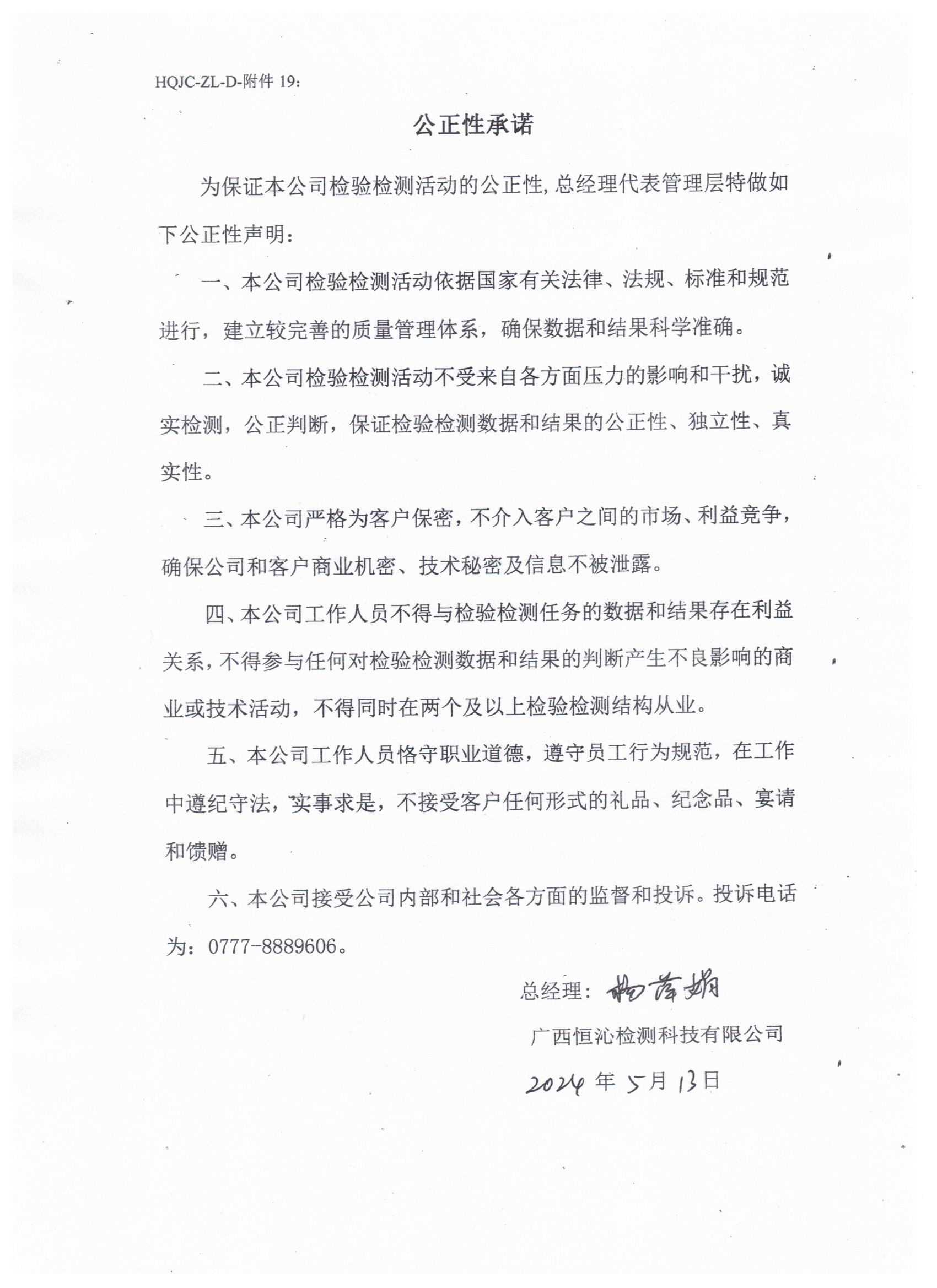 廣西恒沁檢測科技有限公司是在欽州市依法注冊成立的第三方檢驗檢測機構(gòu),位于廣西欽州市高新區(qū)一期曙光園38棟二層,總面積約2160㎡,實驗室總面積約520㎡,擁有先進的分析儀器設(shè)備,專業(yè)于水質(zhì)檢測、環(huán)境空氣與工業(yè)廢氣檢測、噪聲檢測、土壤檢測、礦產(chǎn)檢測、固廢檢測、環(huán)評檢測、環(huán)境驗收檢測、環(huán)境排污檢測等,是獲得CMA資質(zhì)的高新科技環(huán)境檢測服務(wù)公司。廣西恒沁檢測科技有限公司以“科學(xué)管理、公正準(zhǔn)確、高效規(guī)范、持續(xù)改進”為質(zhì)量方針,堅持“質(zhì)量第一、誠信為本、服務(wù)至上”的檢測理念,保證本公司的環(huán)境檢測工作廉潔、高效,恪守第三方公正立場。查看更多